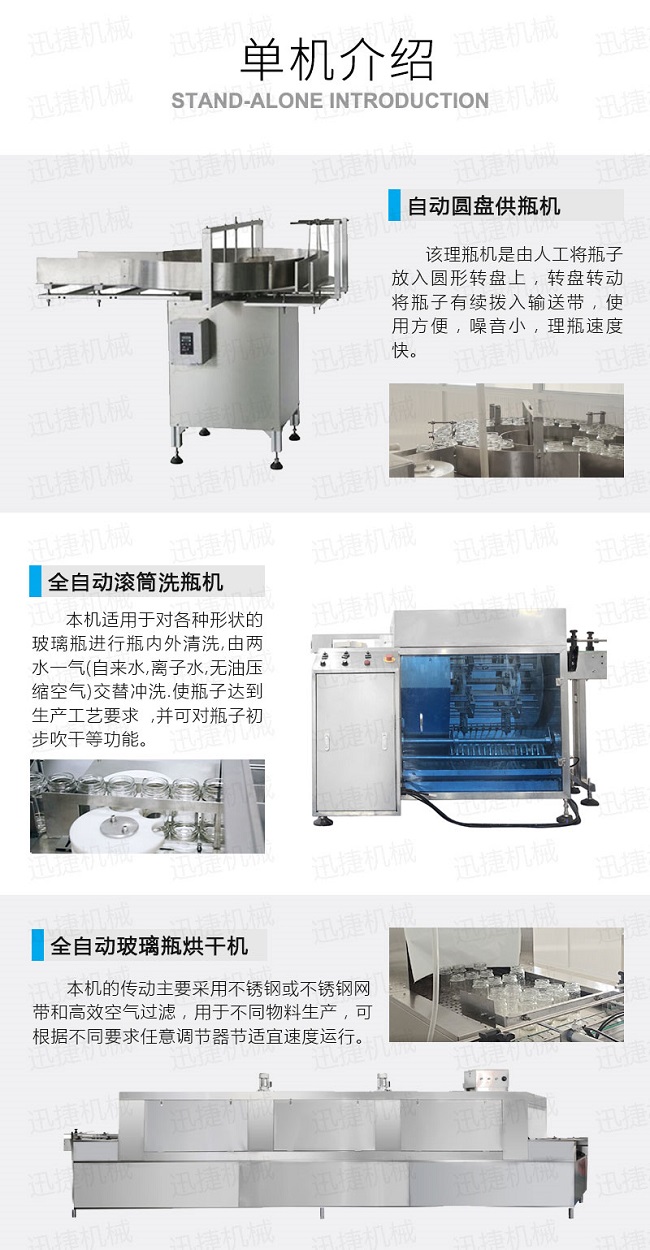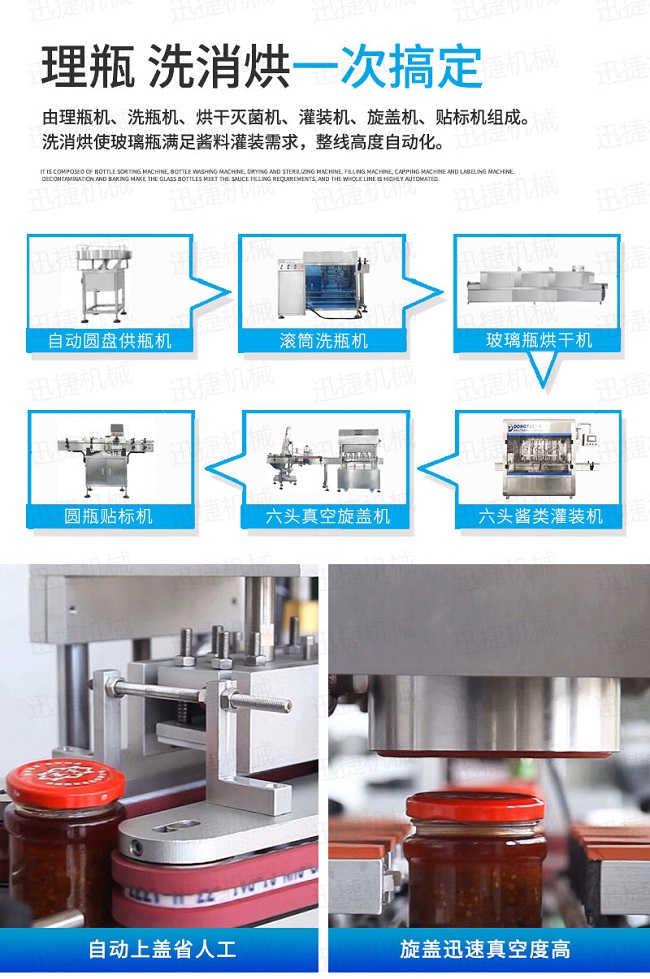 自動供瓶機+全自動滾筒洗瓶機+自動六米烘干機+自動收瓶機+全自動六頭灌裝機自動灌裝+全自動提蓋機自動理蓋、提蓋、掛蓋+六頭真空旋蓋機同時六個頭真空旋蓋+套標機+收縮機+圓瓶貼標機+整理平臺;
