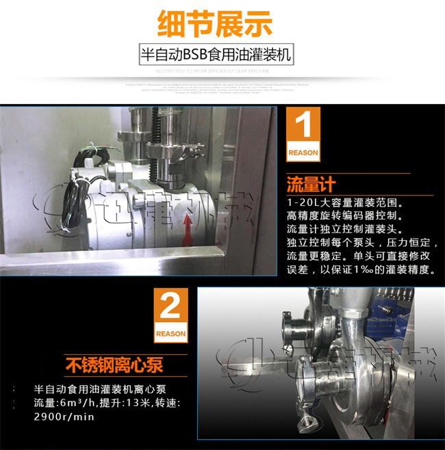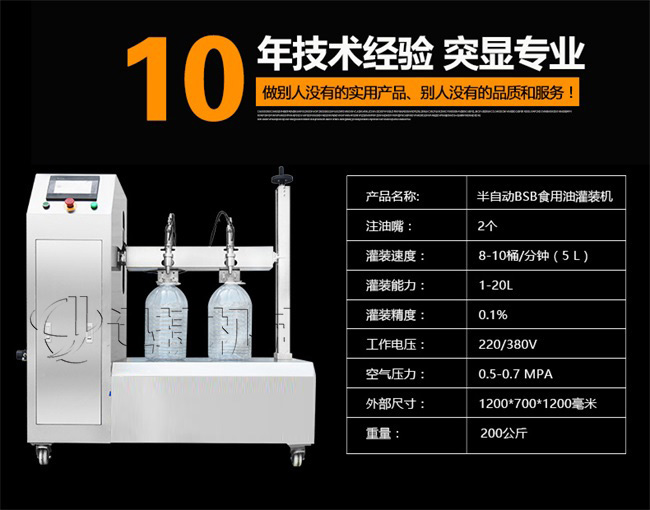 本機(jī)適用于花生油、大豆油、菜籽油、色拉油、芝麻油、石油化工潤滑油等各種油類和粘稠液體的定量要求。半自動雙頭電動BSB食用油灌裝機(jī):采用的微電腦技術(shù),自備動力,管路無需加壓,節(jié)約運(yùn)行成本;自動檢測油浙、自動修正溫度變化引起的密度變化,適合大溫差環(huán)境的油品灌裝工作,使用方便靈活;機(jī)電一體化設(shè)計,安裝方便,整機(jī)價格低廉。